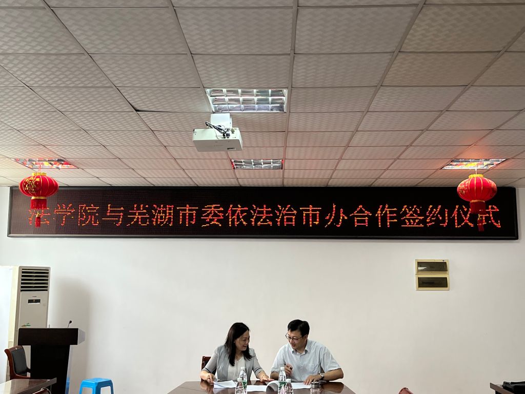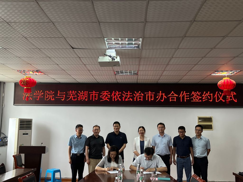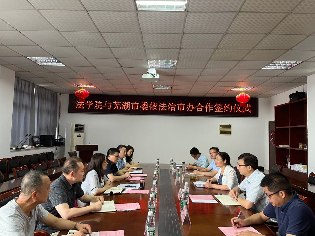 为贯彻“质量立院、特色兴院、人才强院、开放活院”的办学理念,加强学院与政府机关的合作交流,7月7日上午,bet36365路检测中心与芜湖市委依法治市委员会办公室(芜湖市司法局)在bet36365路检测中心会议室举行合作共建“芜湖市法治研究院”签约仪式。芜湖市委依法治市办副主任、市司法局局长李萍,市司法局纪检组长周正辉,市司法局副局长杨静、叶勇,市委依法治市办秘书科工作人员,bet36365路检测中心党委书记赵红、院长周振杰、党委副书记张玉新、副院长高永周、院长助理陈银珠参加签约仪式。仪式由赵红主持。