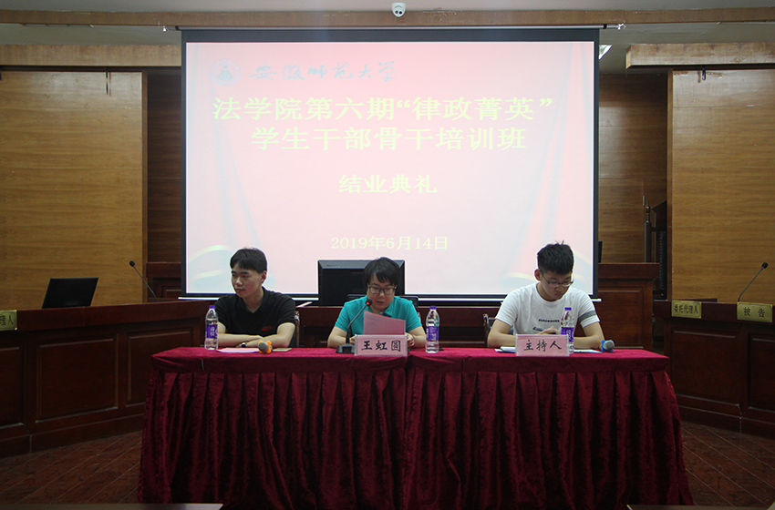 6月14日下午,bet36365路检测中心于教学法庭举行第六期“律政菁英”学生干部骨干培训班结业典礼。院团委书记王虹圆、院团委组织部全体成员、培训班全体学员参与其中,院团委组织部副部长魏长睿主持。