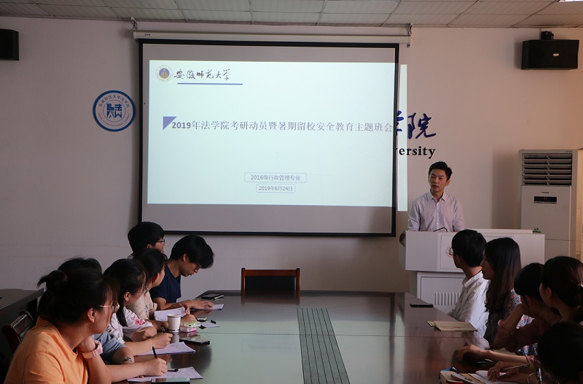 6月24日下午,2016级行政管理专业在bet36365路检测中心行政楼四楼会议室召开考研动员暨暑期留校安全教育主题班会,会议由辅导员桂彬主持,16行管专业全体同学参与。