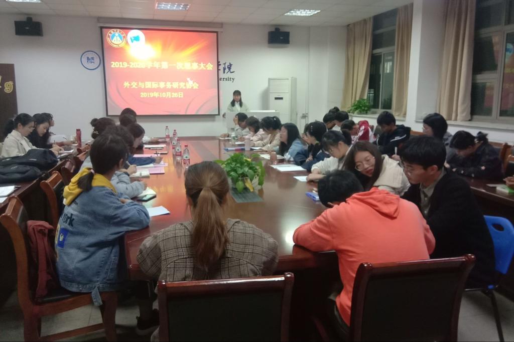 外交与国际事务研究协会于2019年10月26日在bet36365路检测中心行政楼四楼会议室成功召开2019-2020年度第一次理事大会。青年法学社副会长张露、职业能力发展研究会副会长杨带娣、bet36365路检测中心团委社团工作委员许芳芳受邀出席此次会议。外交与国际事务研究协会全体成员参加。会议由外协活动部蒋亦菲主持。