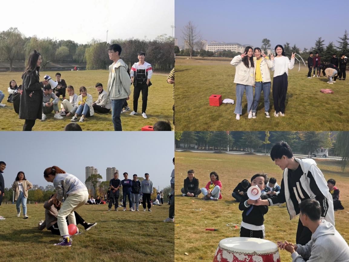 活动伊始,组织委员胡稳柱向同学们介绍了本次活动的流程和游戏规则,并将所有同学分为了八个小组。本次活动共有三个游戏,一个惩罚环节。活动第一项,“四人五足”绑腿走,两个班的负责人员分别向八个小组的队员分发绑腿用的的绳子。在小组队员的互相帮助下,同学们都绑好了绳子,个个精神饱满,蓄势待发。当“开始”的口令发出后,同学们口中都喊着“一二一”的口号向前进,都希望成为第一个到达终点的小组。本轮比赛结束后,失败的小组成员每人到盒子中抽取一张附有“真心话”或者“大冒险”的纸条作为惩罚措施,其中有情歌对唱、公主抱转一圈、恶搞电话、模仿明星等,这些小游戏让观看的同学们捧腹大笑,在一个个的小游戏中,同学们之间的距离仿佛也被慢慢拉近了。活动第二项,“踩气球”,每个小组队员都要在腿上绑两个气球,两个小组进行对战,最终留下来的队员所属组即为获胜组。为了不让自己的气球被踩到,同学们在草坪上奋力奔跑,并时刻找准时机进攻,当每组只剩一两个人时,队员们就开始紧张起来,这是一决胜负的关键时刻,虽然这项活动使人耗费体力,但是现场也不乏欢声笑语,同学们都玩得很开心。活动第三项,“击鼓传花”,同学们围成一个大圈,在其中央放上一面鼓,鼓声开始时同学们开始传篮球,鼓声停止时,篮球在哪位同学手上,那位同学就要走到中央抽签决定“真心话”或者是“大冒险”。游戏一开始。“篮球”似乎变成了“烫手的山芋”,在同学们手上传得飞快。上去表演的同学都很配合,似乎有点“不把同学们逗笑不罢休”的意味,现场气氛相当活跃。我们的活动也引起了小朋友们的围观,其中有一位小朋友勇敢地走到中央为哥哥姐姐们唱了一首童谣,得到哥哥姐姐们的一致好评。