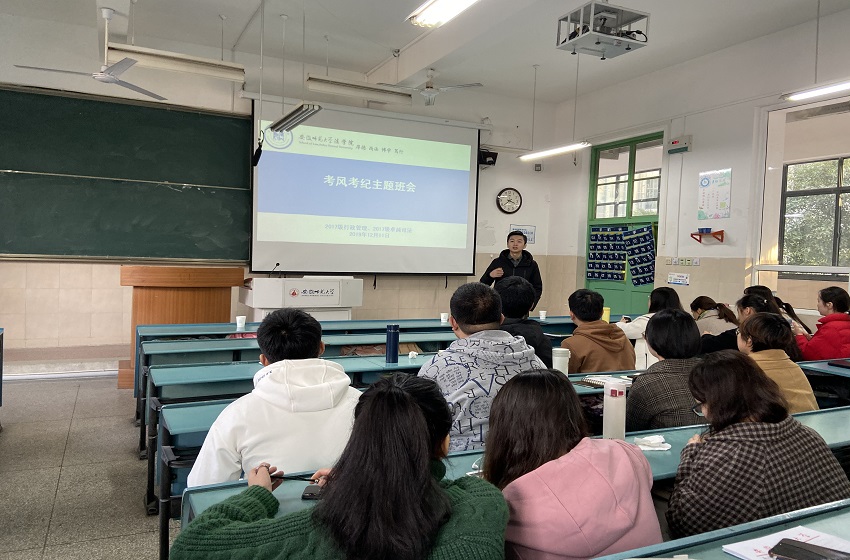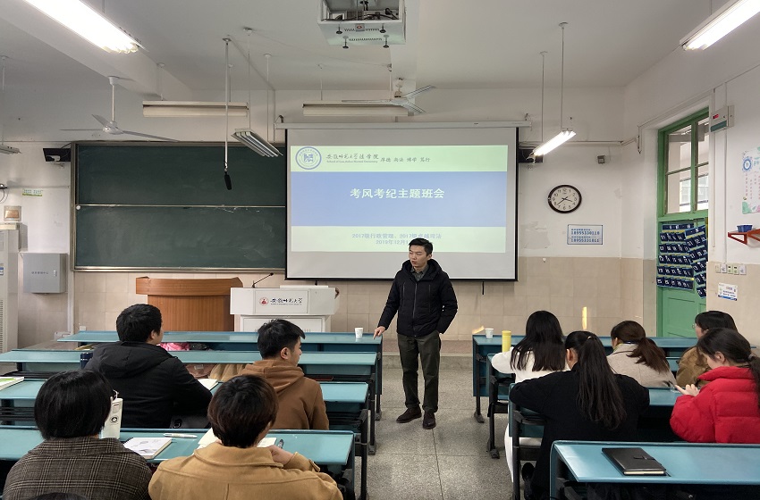 12月17日,17行管、17卓司在2020303教室召开严肃考风考纪主题班会。在进一步加强考风考纪教育的同时,也让同学们更加明确学习目的、严守考试纪律、杜绝考试作弊,倡导同学们端正考风、严肃考纪、文明答题、诚信应考。本次会议由辅导员桂彬主持,17行管班、17卓越司法班全体同学参加会议。