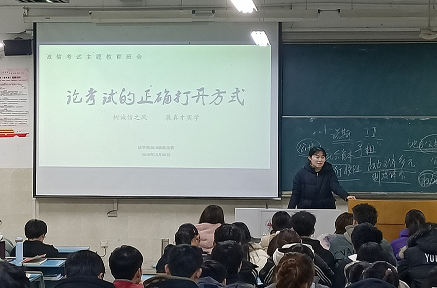 为加强学风建设,端正学生考试态度,2018级行政管理和法学一班积极响应学校建设考风考纪的号召,于12月27日下午在2010304教室开展考风考纪主题班会。本次班会由辅导员冯晟主持,全体同学认真听讲。