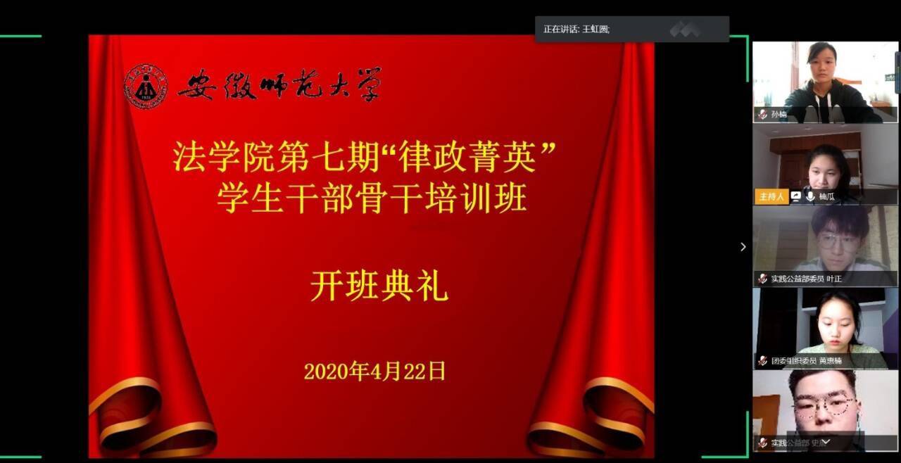 4月22日下午,bet36365路检测中心借助腾讯会议平台举办第七期“律政菁英”学生干部骨干培训班开班仪式。院团委书记王虹圆、院团委副书记储梦凡和冯晟、19级法学和行政管理班辅导员李晨冉、院团委学生副书记兼学生会副主席姚思宇、院学生会主席魏长睿出席开班仪式,培训班全体学员参加仪式,本次开班仪式由姚思宇主持。