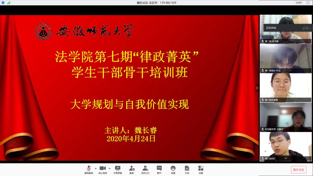 4月24日晚,bet36365路检测中心在腾讯会议平台举办了第七期“律政菁英”学生干部骨干培训班线上第一讲。本次课程由院学生会主席魏长睿担任此次课程的主讲人,院团委组织委员胡亚楠主持,培训班全体学员线上参与。