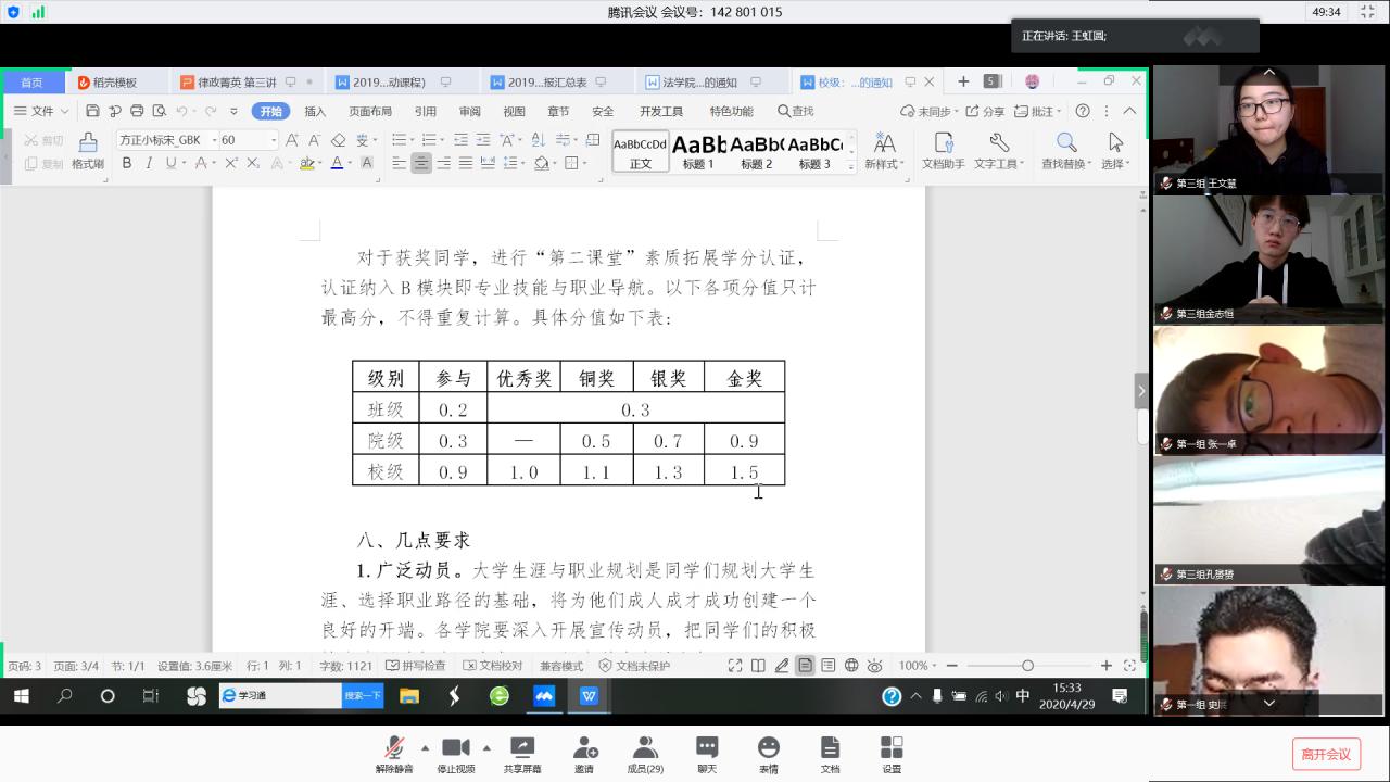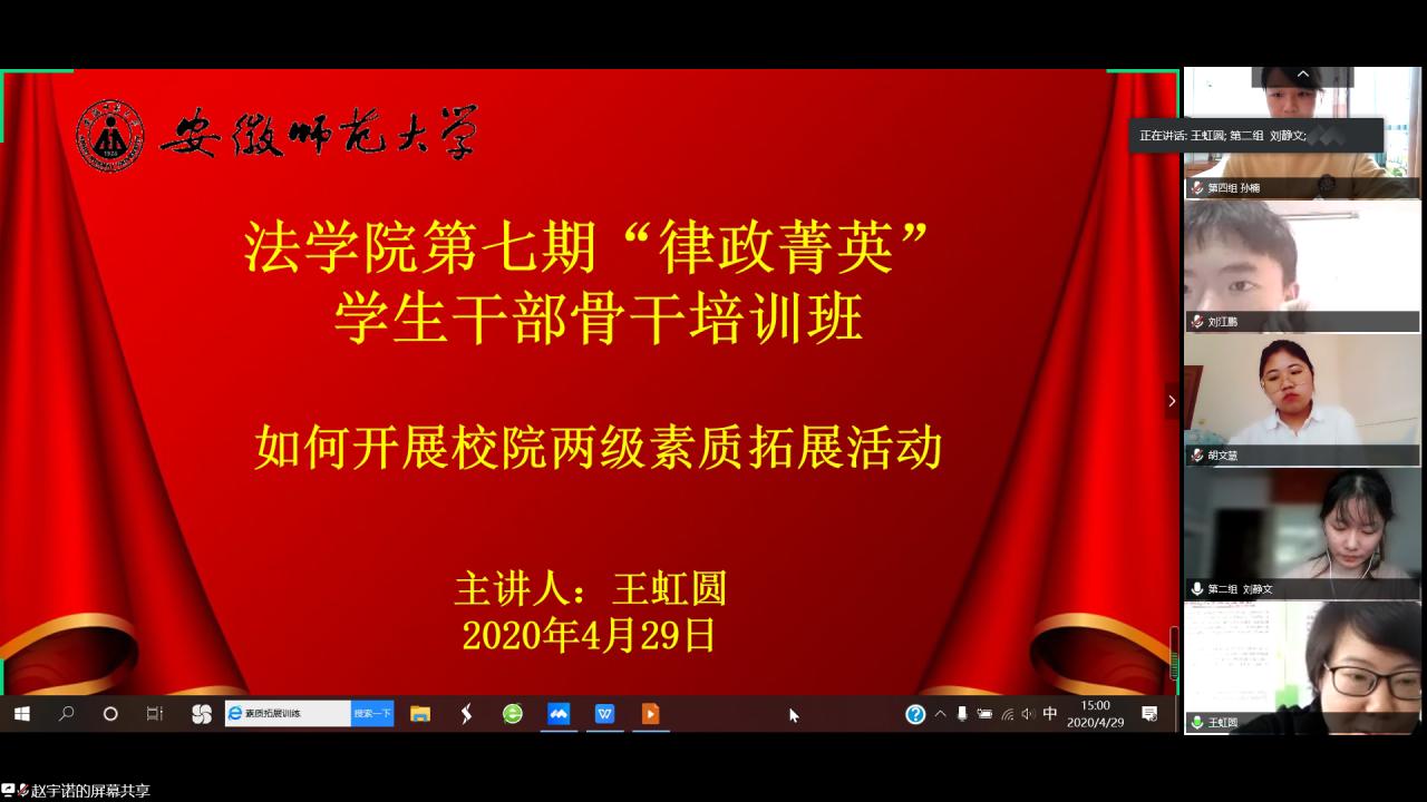 4月29日下午,bet36365路检测中心借腾讯会议平台举办了“律政菁英”学生干部骨干培训班第三讲课程活动。此次课程由院团委书记王虹圆主讲,院团委组织委员胡亚楠进行主持,培训班全体成员参加。