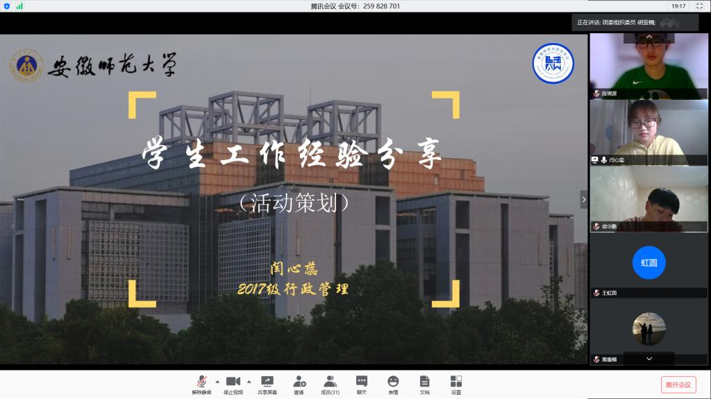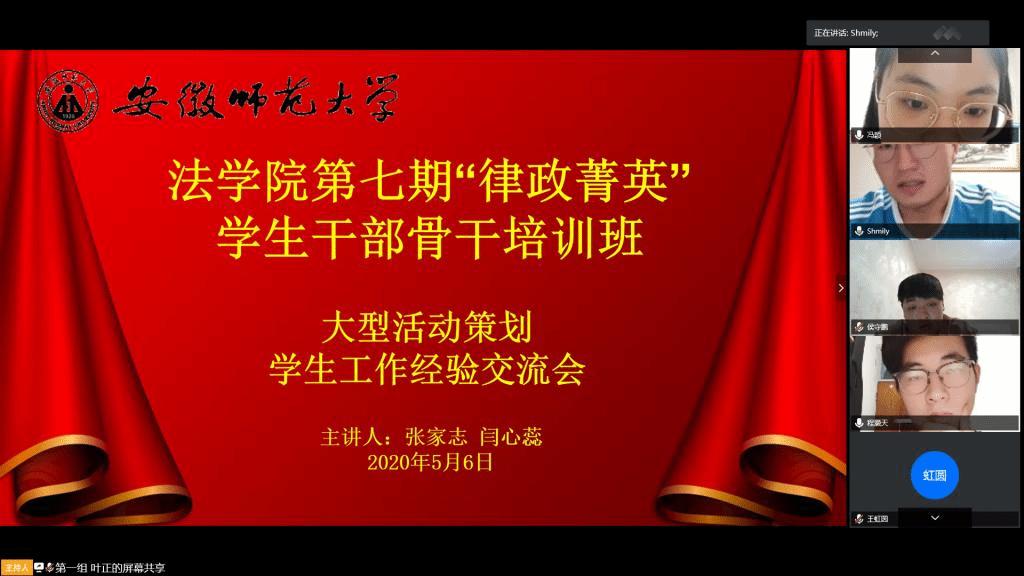 5月6日晚,bet36365路检测中心在腾讯会议平台举办了第七期“律政菁英”学生干部骨干培训班第五讲课程活动。此次课程由bet36365路检测中心第五届院学生会主席团成员张家志和第六届团委办公室主任闫心蕊主讲,院团委书记王虹圆出席,院团委组织委员胡亚楠主持,培训班全体成员参加。