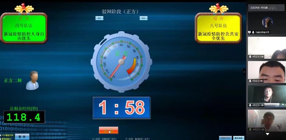 此次辩论赛题目为“新冠疫情防控人身自由/公共安全优先”,采用“四对四”团队对抗辩论形式。比赛现场激烈,选手们准备充分,反应灵敏,配合默契。在立论阶段,选手们精确破题,铿锵立论;驳辩阶段,选手们逐个击破对方漏洞,巧妙回击;在盘问和自由辩阶段,现场气氛热烈,双方妙语连珠,你来我往,互不相让。在最后的总结陈词中,选手们发力十足,驳论与总结并兼。最终,一号、三号、四号和七号队伍获胜。