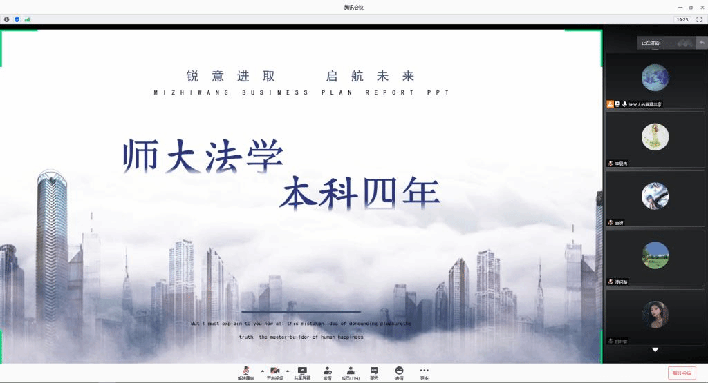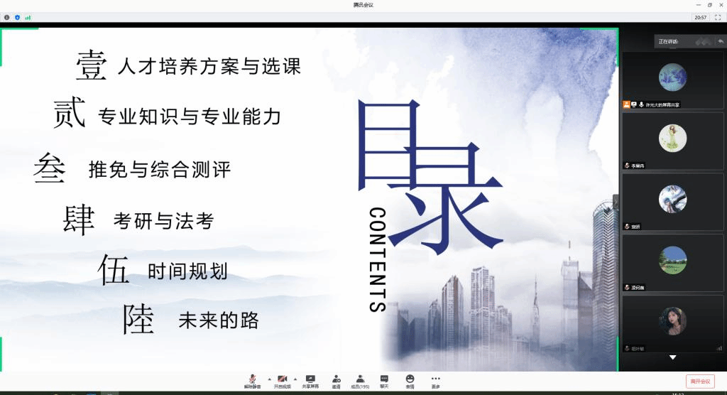 (本网讯 文/摄 王梦羽)一学年的大学生活,足以使同学们对大学有较全面的认识。然而在感受到自由美好的同时,大家又不可避免的会直面对所学专业的疑惑以及对未来的迷茫。为解此忧,7月1日下午,2019级法学专业邀请到学院教学办许光大老师,借助腾讯会议APP为同学们做了题为《锐意进取 启航未来——师大法学本科四年》的精彩讲座,会议由辅导员李晨冉老师主持。
