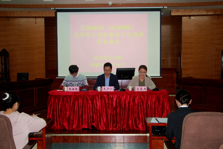 开班典礼在庄严肃穆的国歌声中正式拉开帷幕。班主任李晨冉向大家介绍了本期培训班的一些基本情况和培训内容,包括课堂考勤、学习要求等。她阐述了举办入党积极分子培训班的意义,希望广大学员做到思想重视、勤于思考,认真学习相关材料,认真听取辅导报告,珍惜此次培训机会,争取获得收获与成长。随后,党校副班主任张楠楠宣读本次培训班的班委名单以及学员分组情况。培训班学员代表卫苏同学发言,她鼓励大家加深对党的认识,端正入党动机,坚定入党决心,严格要求自己,争取早日加入党组织。最后,王少仁书记代表学院党委做动员讲话,从进一步“坚定理想信念”、“强化理论武装”、“发挥表率作用”三个方面对学员提出要求,并期望学员们树立坚定的共产主义信念,在以后的学习、工作与生活中发挥先锋模范和骨干带头作用,争做德法兼修的优秀青年。