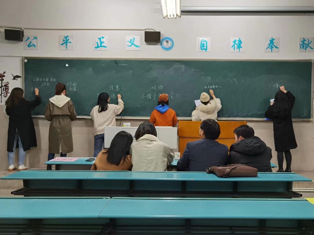 比赛以“提笔忆抗美援朝,染墨书先辈风华”为主题,分为粉笔字、钢笔字、毛笔字三项。比赛现场秩序井然,参赛选手们专注认真。首先开始粉笔字比赛,选手们按照组别依次在黑板上写下古诗词,字字遒劲,落笔成风。在钢笔字环节中,选手们精神饱满,一笔一划认真抄写,提笔落笔之间尽显自信大方。毛笔字环节同样精彩绝伦,同学们以毛笔挥洒墨水,墨香之中显示出法苑学子的多才多艺。选手们的书法或潇洒飘逸,或端正工整,参赛作品清晰合理,整体观感自然美观。