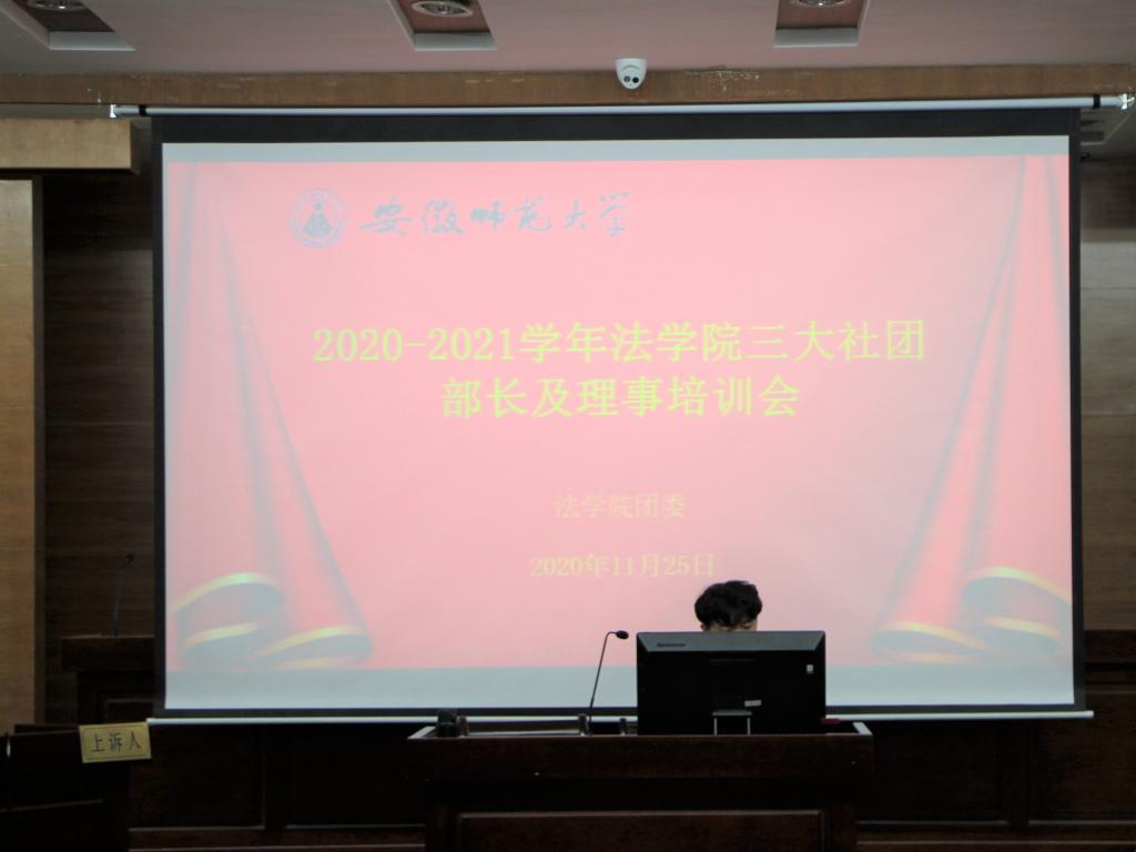 11月25日下午,bet36365路检测中心于模拟法庭召开2020-2021学年三大社团部长及理事培训会。院团委书记王虹圆、团委学生副书记郭怡、学生会副主席程玉妍、bet36365路检测中心三大社团会长团出席,三大社团各部门部长及理事参会。会议由团委社团管理部刘江鹏主持。
