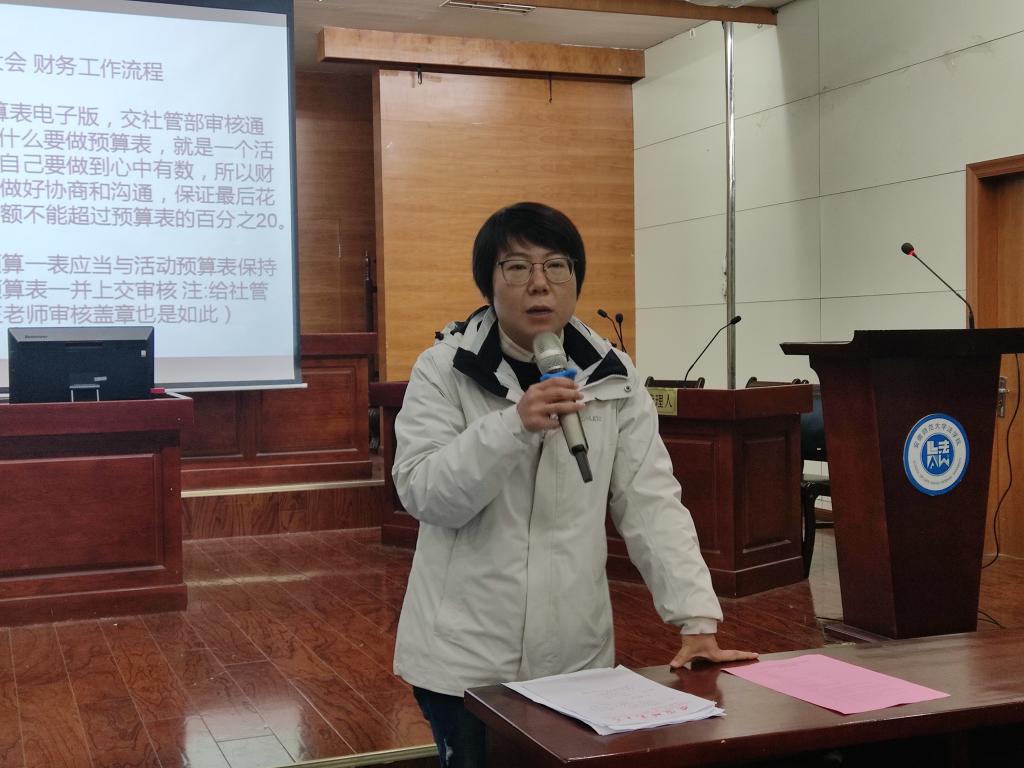 会议伊始,团委社团管理部叶玉珍介绍社团财务工作相关要求,阐释财务工作流程,强调了各类文件的填写规范。团委素质拓展部刘静文阐明istar第二课堂的相关原则,讲述了签到评分、报名管理等相关要求。刘江鹏则从公文材料的撰写规范角度,说明公文材料中的字体字号要求,并提醒大家重视文件附件的格式。随后三位发言人就财务报告、istar第二课堂及公文材料规范为在场人员答疑解惑。会议尾声王虹圆对此次培训会做指导点评,她希望社团工作者能够端正工作态度明确内部分工,在合理分配工作的基础上提高工作效率。同时要规范合理使用会费、灵活高效工作、注意存档活动。