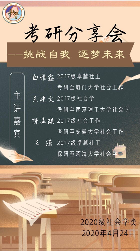 (本网讯 刘金金 程冉)为促进班级同学明晰目标、确立方向,4月24日晚,2020级社会学类在行知楼2040101教室开展考研分享会。2017级社会工作、卓越社工、社会学专业白雅馨、王潇、王建文、陈嘉琪四位同学受邀参会,会议由2020级社会学类班长赵俣旸主持,2020级社会学类全体学生参与。