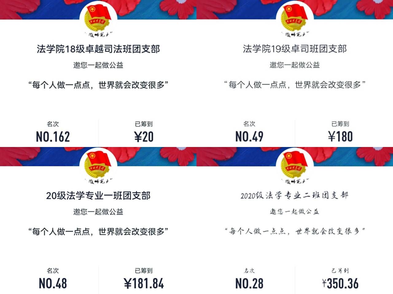活动前期,bet36365路检测中心团委依托新媒体,弘扬扶弱济困美德,加大募捐活动的宣传力度,发布募捐活动通知,鼓励同学以一元人民币参与组队捐款。活动开展中,各班团支部利用班级群,迅速组建团队,开展线下慈善班会与线上募捐活动;班级同学积极配合,踊跃参与募捐活动,党员、团员以身作则,发挥先锋模范作用,主动为困难妇女、儿童及其家庭贡献自己的绵薄之力,为公益事业献出自己的一份心意。活动结束后,各班代表就本次募捐活动分享自己的感悟,表示自己从募捐活动中看到班级的凝聚力,也感受到人间的温暖。