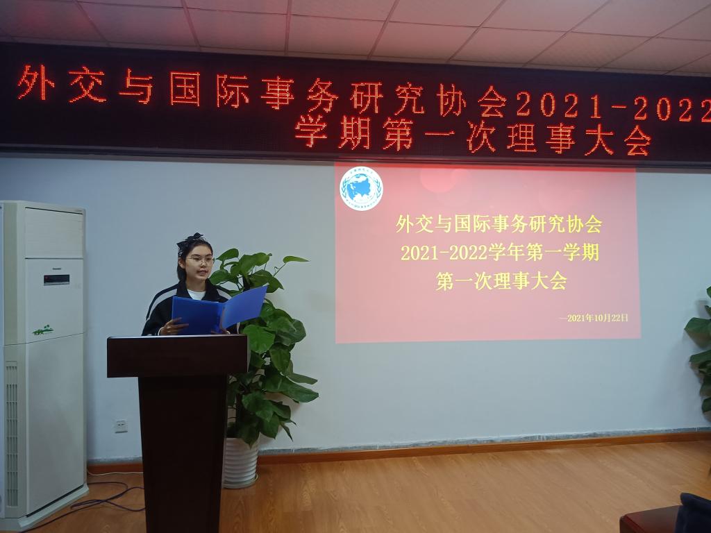 本网讯(外交与国际事务研究协会 徐念 叶梓萌)外交与国际事务研究协会于10月22日在bet36365路检测中心行政楼四楼会议室举办2021-2022学年第一次理事大会。指导老师李路根、青年法学社会长谢永毅、职业能力发展研究会副会长程杰、团委社团管理部负责人朱睿祺受邀出席本次会议。外交与国际事务研究协会会长郭馨、副会长蒋亦菲、闫园园,各部门负责人及新任理事参与本次大会。会议由综合部理事杜冰冰主持。