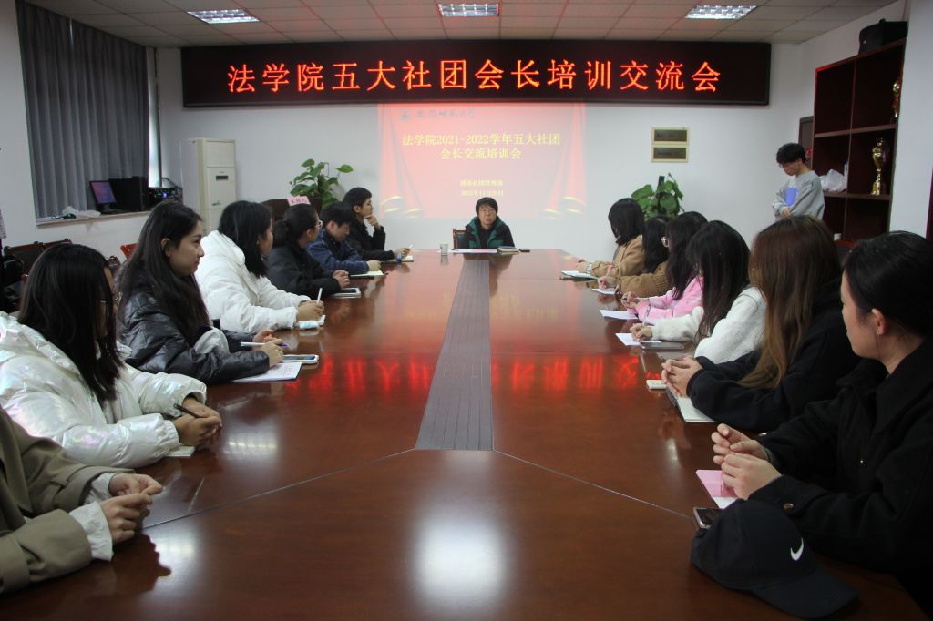 本网讯(bet36365路检测中心团委 王虹圆 孟理想)11月25日下午,法学院团委在行政楼召开2021—2022学年bet36365路检测中心五大社团会长培训会。bet36365路检测中心院团委书记王虹圆、团委委员张志轩、五大社团会长团及团委社团管理部部门负责人朱睿祺出席会议。