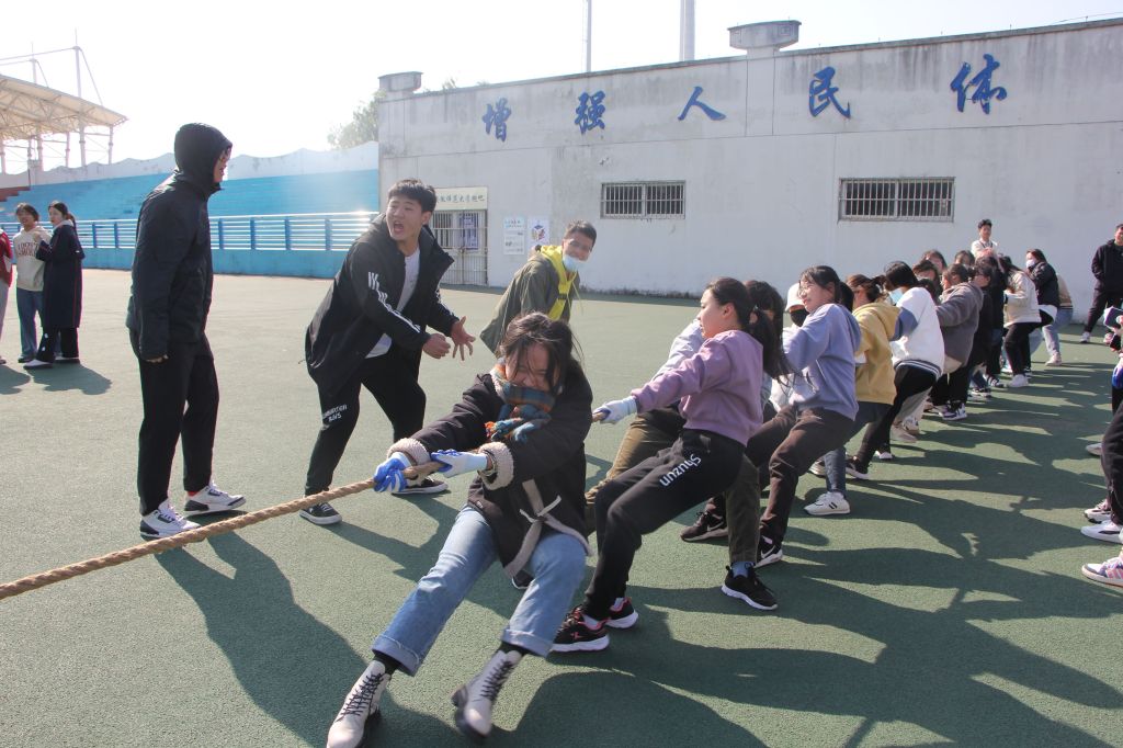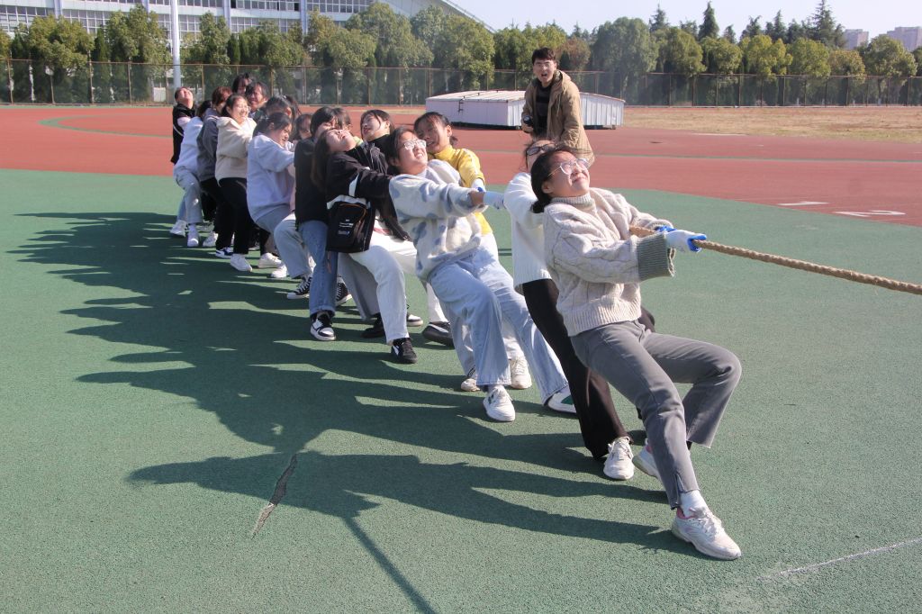 比赛正式开始前,工作人员详细讲解比赛规则、强调注意事项,维持场上秩序。随着裁判一声哨响,参赛队员双手紧握长绳,口号一致戮力齐心,铆足了劲将红绸拽向自己的阵营。观赛同学们则在一边为参赛选手高喊加油,呐喊声响彻云霄。每一位队员都充分掌握拔河技巧,降低重心后仰发力,动作连贯一气呵成,胜负只在瞬间,观赛人员爆发出一阵阵欢呼喝彩,将现场气氛推至高潮。赛后,工作人员组织各班选手有序离场。同学之间的友谊也在此次团队协作中愈发深厚。