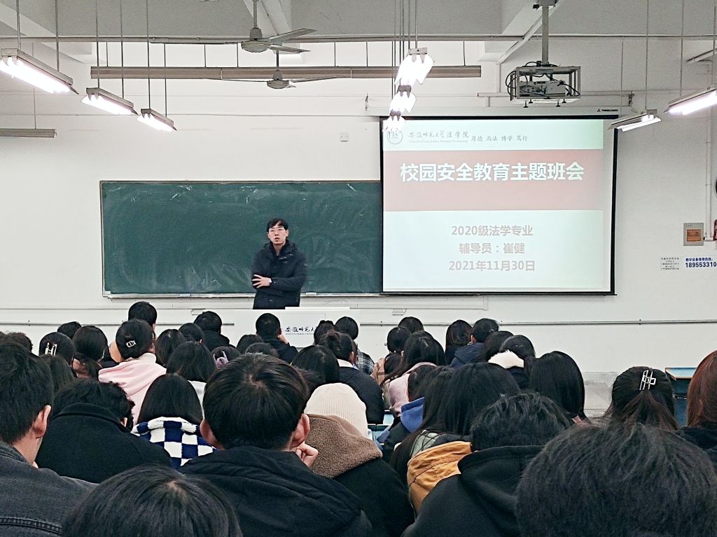 本网讯(bet36365路检测中心 崔健 韩莹莹 何灿)为进一步普及安全知识,增强防范意识,切实加强学生在校期间的安全教育。2020级法学专业先后于行知楼召开多次校园安全教育主题班会。班会由辅导员崔健主讲。