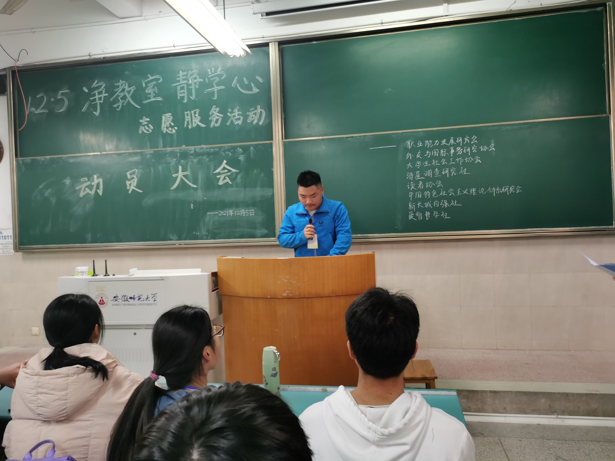 本网讯(职业能力发展研究会 方芷若)为了创造良好的学习环境,丰富学生课余生活,强化服务意识,培养志愿者精神。12月5日,职业能力发展研究会同外交与国际事务研究协会、大学生社会工作协会、海星调查研究社、读者协会、爱智哲学社、中国特色社会主义理论体系研究会及新长城自强社于行知楼2020103联合举办12·5“净教室,静学心”志愿服务活动,八大社团负责人、部门负责人及理事全部到场。活动由职研综合部理事熊芮主持。