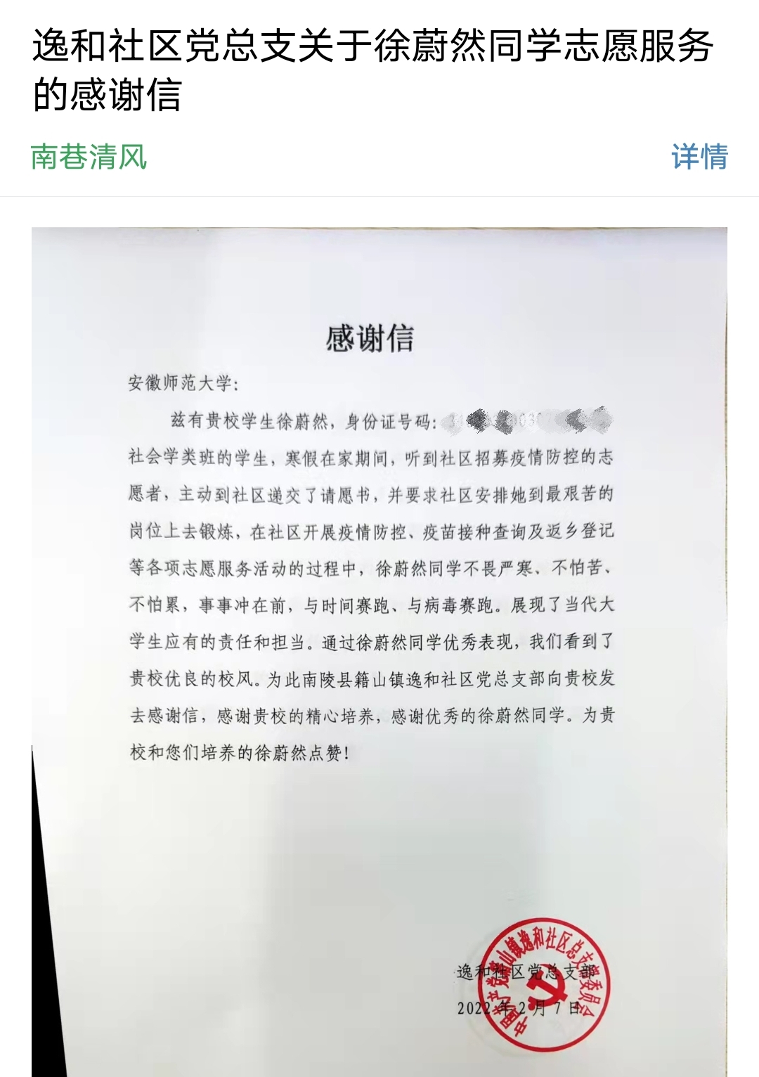 徐蔚然是bet36365路检测中心2021级社会学类2班的一位同学,来自芜湖市南陵县。对她而言,这个假期最有意义的事莫过于加入社区疫情防控志愿服务队伍中来。在社区开展疫情防控、疫苗接种查询及返乡登记等各项志愿服务活动的过程中,都能看见她忙碌的身影。徐蔚然不畏严寒、不怕苦、不怕累,工作认真负责,展现了新时代青年的责任担当,发扬了乐于奉献的优良校风。