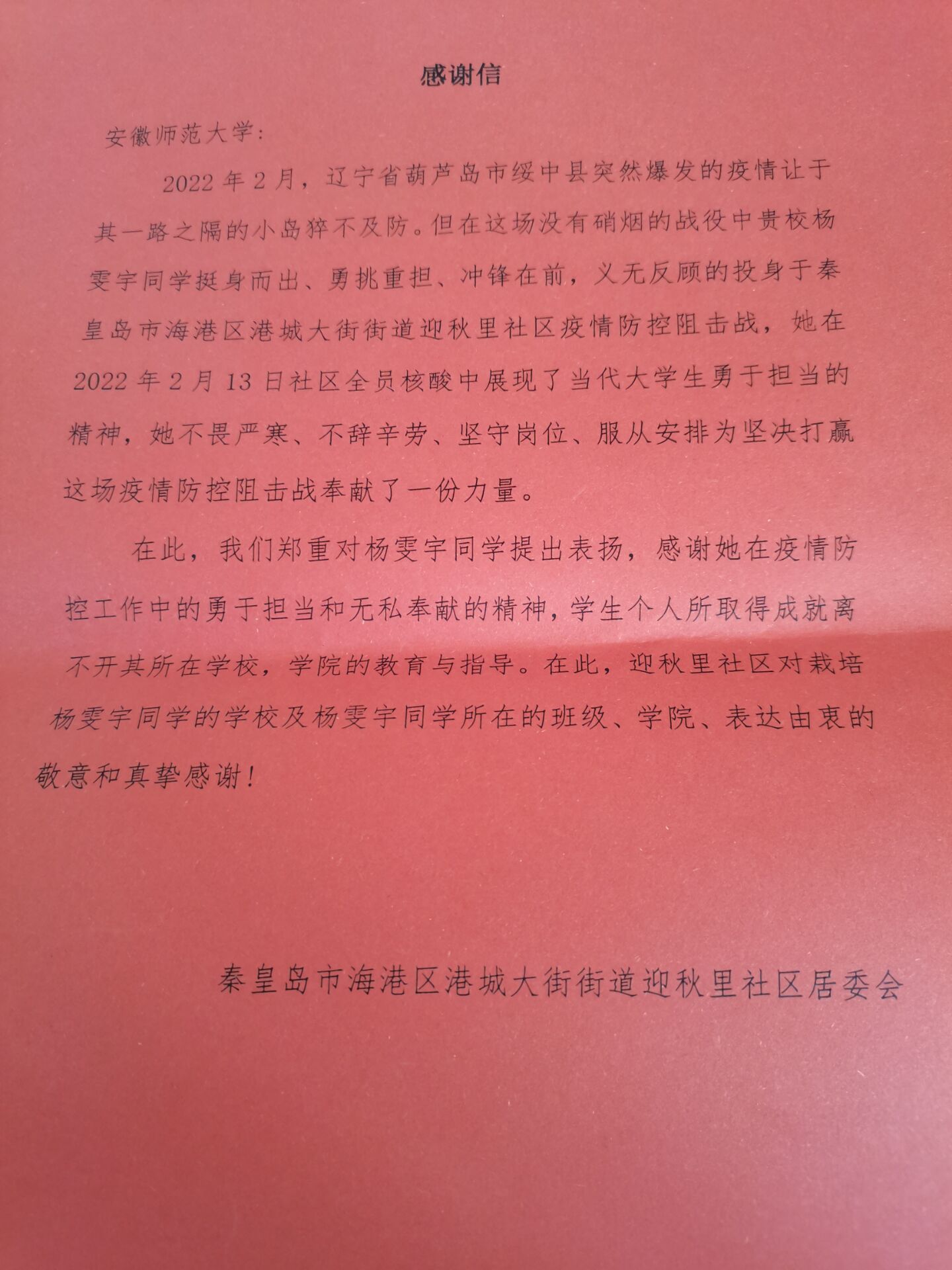 来自河北秦皇岛的杨雯宇同学假期返乡后,辽宁省葫芦岛市突然爆发疫情,她没有一丝犹豫主动联系社区,加入到疫情防控志愿服务队伍当中,负责登记社会每家每户的核酸检测情况。她说:“穿上‘红马甲’意味着一种责任,虽然天气寒冷,但想到在家乡疫情防控工作中发光发热就会异常兴奋。”开学前夕,杨同学依依不舍地脱下了“红马甲”,社区管理人员纷纷表示,从她身上感受到了当代青年学子对国家真挚的情感、勇于承担责任和使命,社区为此专门向bet36365路检测中心寄去了感谢信。