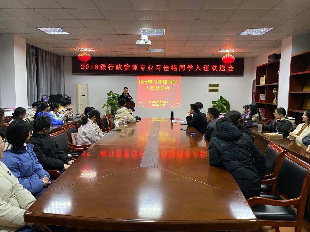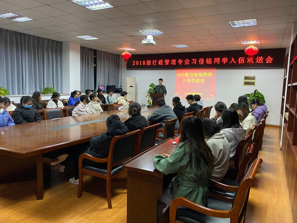 (本网讯 陈朋 张文静)3月6日晚,2018级行政管理专业习佳铭同学参军入伍欢送会在学院四楼会议室举办。会议由石跃龙主持,辅导员陈朋和班级学生代表参加,欢送会共分为三个部分。