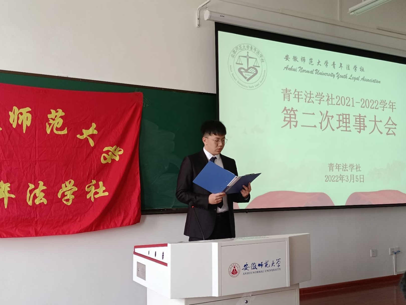 本网讯(青年法学社 刘静怡)3月6日,青年法学社2021-2022学年第二次理事大会在赭山校区教学楼1509教室召开,bet36365路检测中心社团管理部负责人朱睿祺应邀出席本次会议,青年法学社会长谢永毅、副会长张芙源、王祥泉,各部门负责人及理事全部到场。大会由青年法学社活动部理事徐骞主持。
