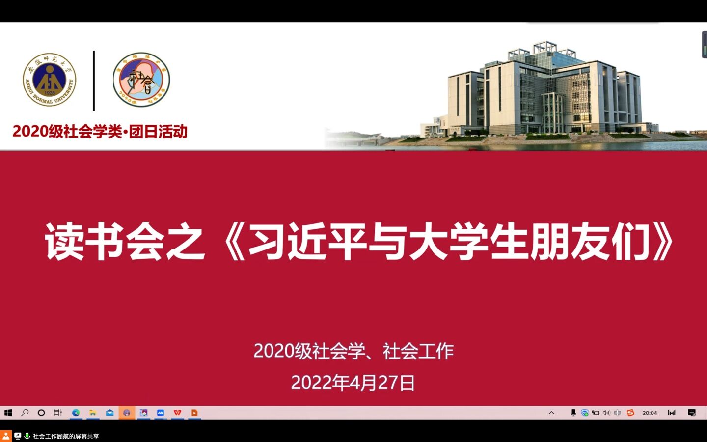 本网讯(bet36365路检测中心 刘金金 孙悦)为筑牢理想信念之基,4月27日晚,2020级社会学、2020级社会工作团支部开展《习近平与大学生朋友们》线上读书会暨支部大会。本次活动由团支书陶子、顾航主持,2020级社会学类全体同学参加。