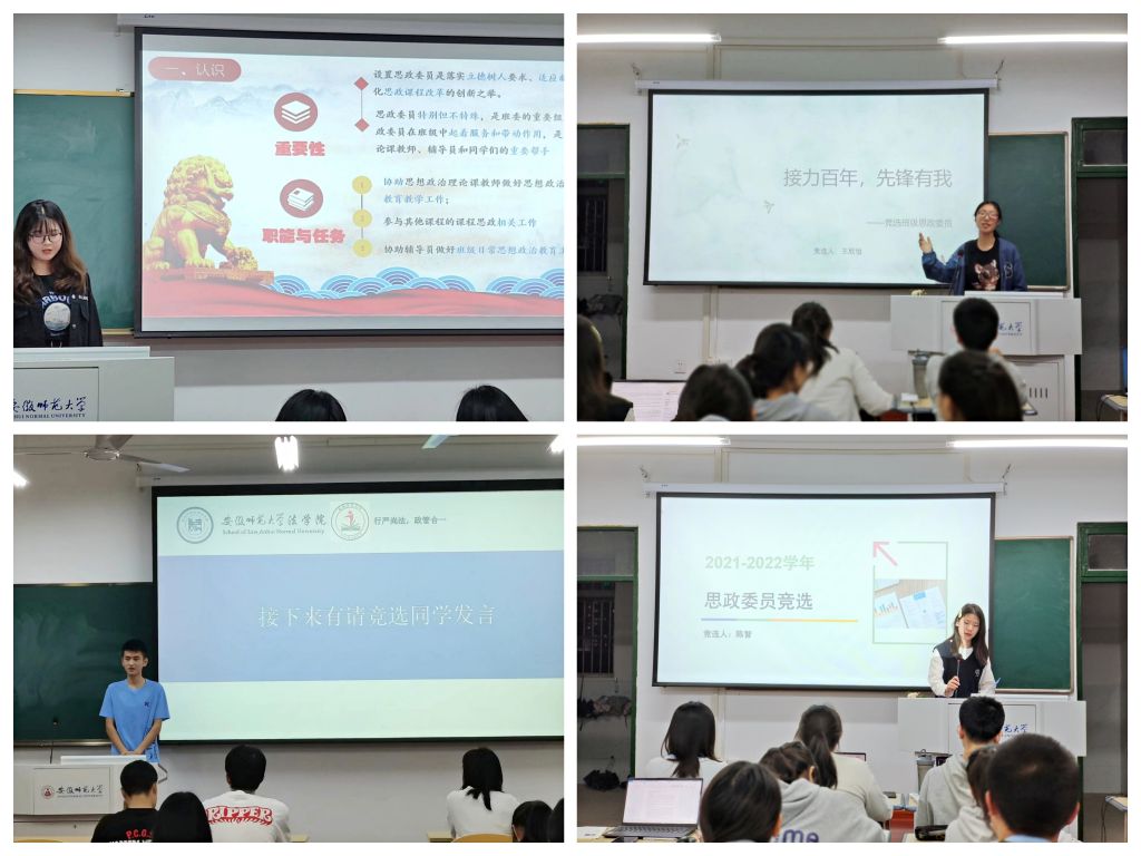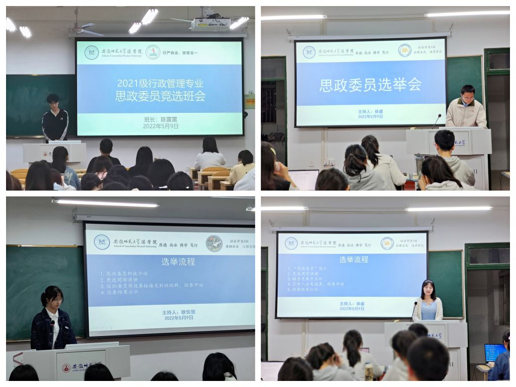 本网讯(bet36365路检测中心 赵悦 李宇欣)为落实立德树人根本任务,结合学校《关于设立学生班级思想政治委员的通知》,5月9日晚,2021级行政管理专业和社会学类于教学楼班级固定教室先后举行“思政委员”班级竞选会。班会由班长陈雷雷、徐盛、耿佳慧分别主持,班级全体学生参加,辅导员赵悦参会点评指导。