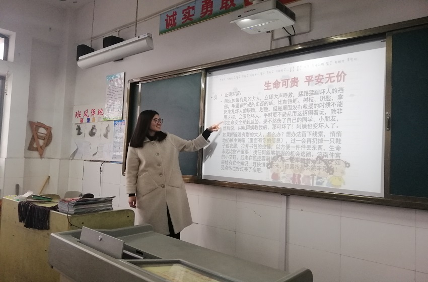 吕响于中学七年级2班主讲,唐嘉怡、李娜分别在小学五年级3班和2班进行授课。吕响以“未成年保护”为主题向同学们讲解了有关于未成年人保护法的内容。唐嘉怡以“交通安全”为主题,普及了危险驾驶的相关知识,并和同学们一起讨论了不文明驾驶的错误行为以及相应的正确驾驶行为。李娜则是以“拐卖儿童”为主题,生动阐述了生命可贵,平安无价,且以提问的方式讲述了孩子们走失后的正确对策。他们通过播放法制小视频,运用通俗易懂、图文并茂的画面和语言,结合真实、生动的案例,与同学们进行趣味互动等形式,调动了同学们的积极性。同学们热情洋溢、情绪饱满,踊跃的参与互动。
