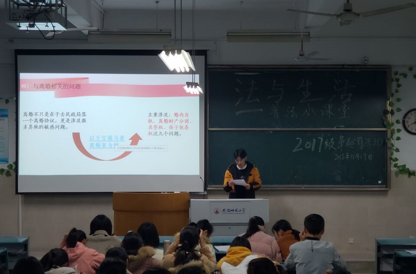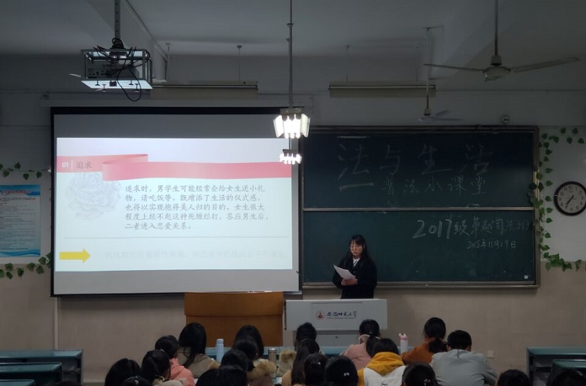 为了帮助同学们学会在实际生活中运用法律保护自我,提高说法能力。11月19日晚,17级卓越司法班第三团小组同学在班长俞雪的主持下于行知楼2020304教室为18级行政管理班级进行了一场有关大学生恋爱和法律相关话题的普法交流。