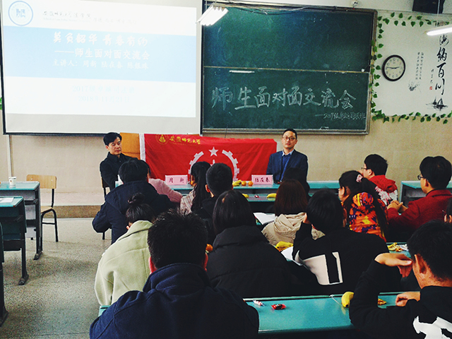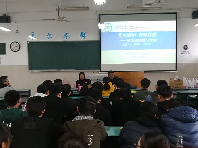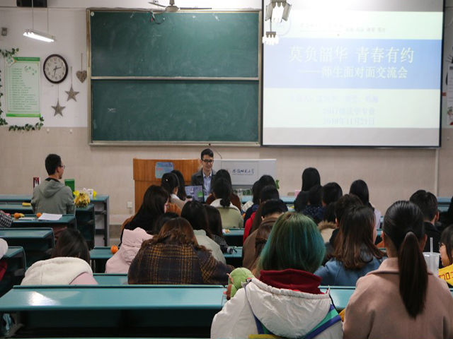 彼时当年少,莫负好时光。为促进师生交流,促进学生发展。2017级法学专业各班于11月21日在行知楼2020303、2020304、2020404教室分别开展了师生面对面交流会。程敏、李光宇、韩瀚、黄莹、周新、陆在春参加交流会,2017级本科生参与其中。