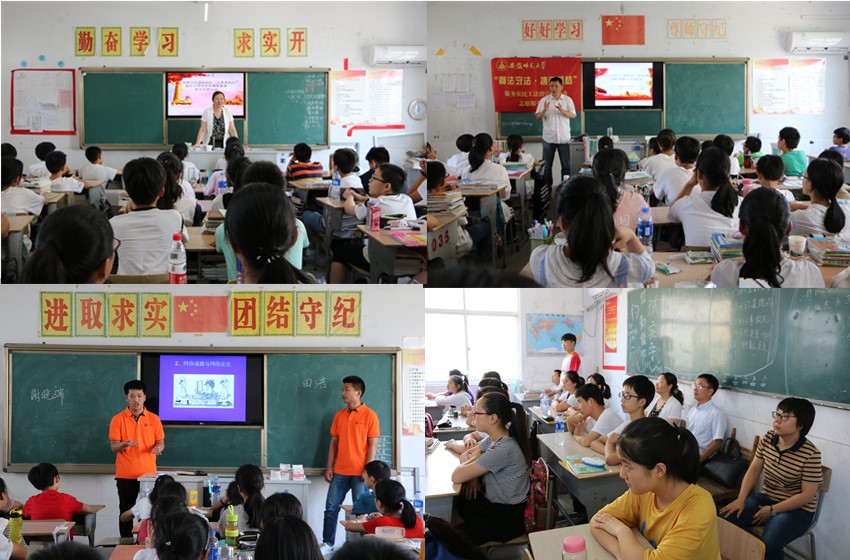 法治课堂暑期社会实践活动主要以学生授课的方式进行,邱浩、冷洪志、田浩与谢晓瑞分别给稼祥中学留守儿童中心七(1)班、七(2)班、七(3)班的孩子进行未成年人普法教育,围绕校园安全风险、未成年人的犯罪预防以及未成年人的权益保护三个方面进行讲解。主讲人根据PPT,将理论与案例相结合,增强了学生对讲解内容的理解。李路根简要介绍了《中华人民共和国宪法》的地位和作用。在整个讲解过程中,孩子们与宣讲人员形成了良好的互动,对于孩子们的疑问,宣讲人员都进行了耐心的解答。