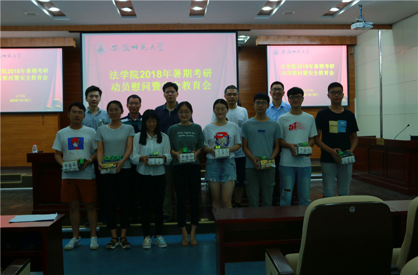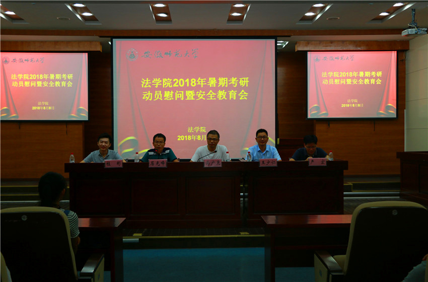 8月8日下午,bet36365路检测中心2018年暑期考研动员慰问暨安全教育会在模拟法庭举行。院党委书记马广见、党委副书记王少仁、副院长严宏,2015级法学专业辅导员桂彬和2015级全体留校考研学生参加会议,会议由副院长屈光峰主持。