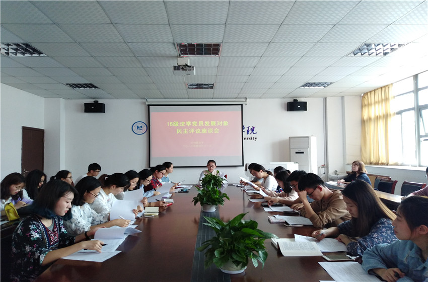 4月21日,2016级法学专业于院行政楼四楼会议室召开党员发展对象群众座谈会。本次会议由辅导员储梦凡主持,15位候选人以及部分班委、团小组组长、候选人室友等学生代表共同参会。