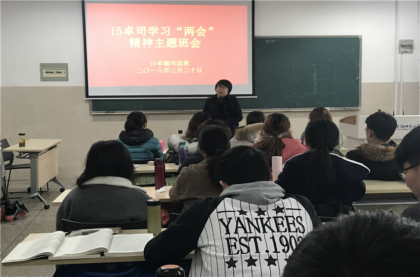 为深入学习“两会”精神,培养同学的国家主人翁意识与担当意识,3月21日,15级卓越司法班召开学习“两会”精神主题班会,此次班会由15卓司辅导员王虹圆主持,班级全体同学参与。