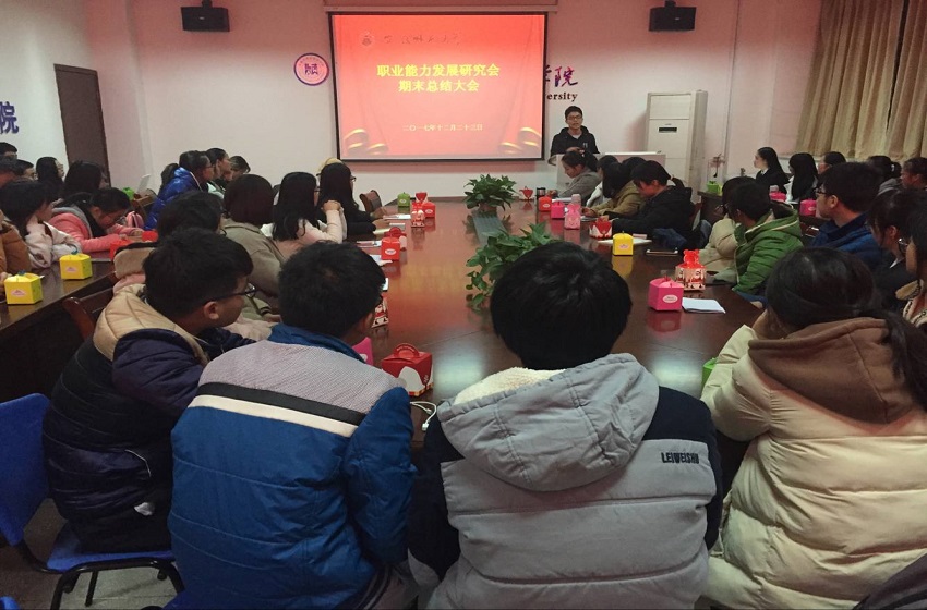 12月23日晚,职业能力发展研究会于bet36365路检测中心行政楼四楼会议室召开了2017—2018学年第一学期期末总结大会。职研会会长团成员及各部门部长、理事参与本次大会。