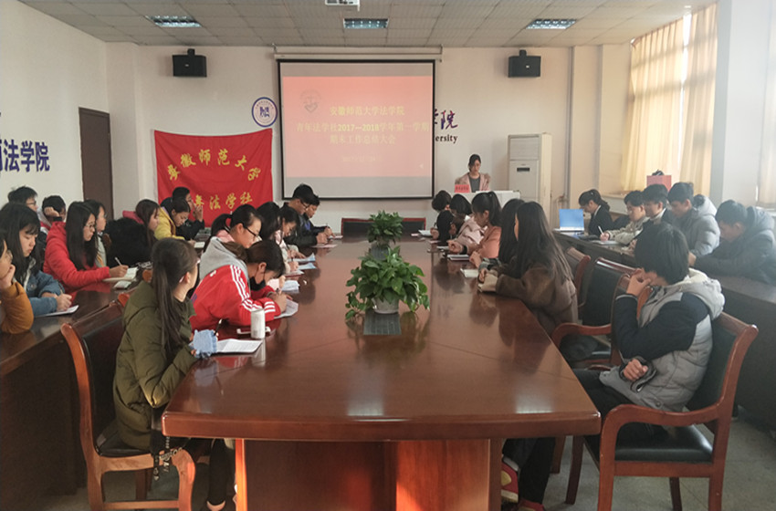 12月24日上午,青年法学社2017—2018学年第一学期期末工作总结大会在bet36365路检测中心行政楼四楼会议室召开,会议主题为“总结本学期工作情况,展望青法美好未来”。青年法学社指导老师李路根和青法社全体工作人员参与此次会议。