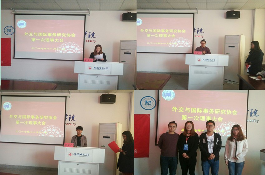 11月11日下午,外交与国际事务研究协会在bet36365路检测中心行政楼四楼会议室召开了第三届理事大会。出席此次会议的嘉宾有青年法学社副会长郑卓、职业能力发展研究会常务副会长宋杰、院团委社管部部长张博雪,外交协会会长孙瑞、各部门正副部长以及新任全体理事共计四十余人参与了此次会议,大会由办公室副部长叶媛媛主持。