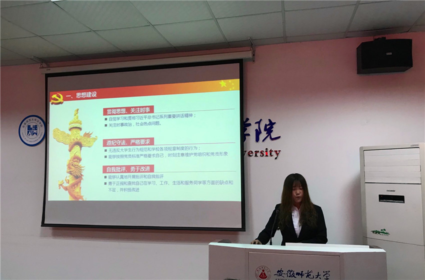 会议第一阶段,34位候选人先后以PPT的形式向党组织汇报自己的思想状况以及各方面的成绩。大家结合自身的成长经历,从自己的生活、学习、学生工作等方面认真剖析自我,阐述着自己的进步之处,反思自己的不足之处,表达着对党组织的忠诚与信仰,大家都表示“将进一步学党章党规,完善自身不足,深化思想,提高觉悟”。