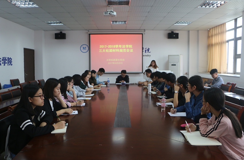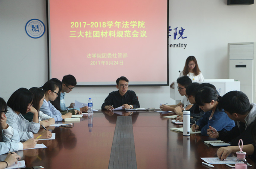 9月24日上午,bet36365路检测中心团委社团管理部于学院行政楼四楼会议室召开2017——2018学年学院三大社团材料规范会议。院团委学生副书记刘闯、青年法学社会长张楠楠、职业能力发展研究会会长宋杰受邀出席,院团委社团管理部成员、素质拓展部部长刘英相及社团各部门部长参加,会议由社团管理部部长张博雪主持。