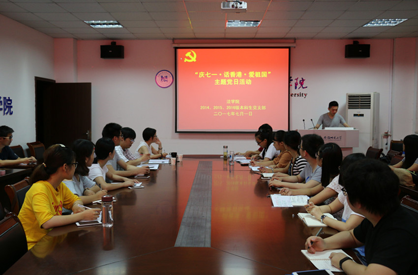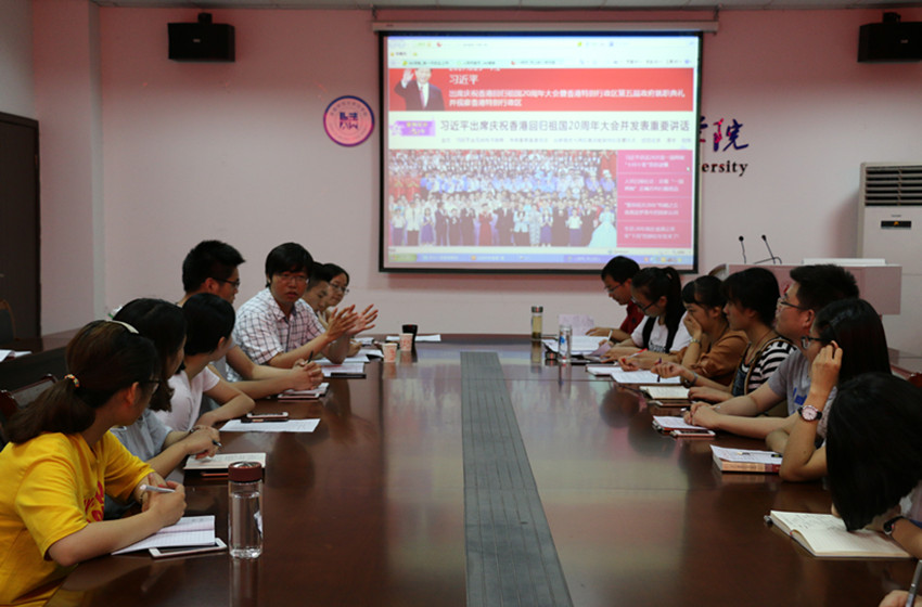 为庆祝中国共产党成立九十六周年与香港回归二十周年,7月1日晚,bet36365路检测中心2014、2015、2016本科生党支部于行政楼四楼会议室举办“庆七一·话香港·爱祖国”主题党日活动。院党委副书记屈光峰、学院辅导员瞿津津、郭敬东、桂彬、储梦凡出席活动,学院学生党员代表、入党积极分子代表参与其中。此次活动由储梦凡主持。