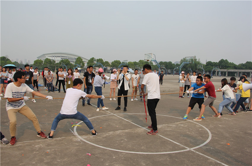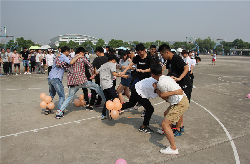 各班级同学依次入场,排好队伍后,趣味运动会正式开始。首先进行的是一网打进——篮球投篮,各参赛队伍派两名队员背部夹篮球,从划定区域的一点跑至另一点,一名同学负责在三分线外投篮。比赛过程中,各位选手相互配合,尽全力多运球,多投中。紧接着是战战兢兢——两人三足踩气球,参赛队伍需用其中的一只脚去踩别人的气球,并且还要保护自己的别让别人踩破。哨声一响,各队之间的战斗便已打响,气球的爆炸声此起彼伏。第三个项目是你来我往——乒乓球接力赛,即各队员用球拍运送乒乓球,到达终点之后换人运至起点,先结束的获胜。同学们各出奇招,尽量缩短运送距离。最后进行的是拔河比赛,各班级学生坚持不懈,使出浑身解数拔河,场外观众为比赛选手们呐喊助威,热烈的气氛将整场比赛推向高潮。最终,15级卓司凭借绝对优势取得全场第一的成绩。