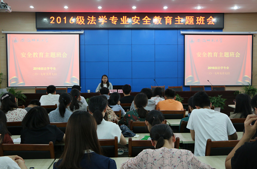 为响应学校关于加强学生安全教育的号召,加强学生对安全问题的重视,提高同学们的安全防范意识,5月7日,2016级法学专业于第三报告厅召开安全教育主题班会。本次班会由16级法学专业辅导员储梦凡主持,16级法学专业同学参加。