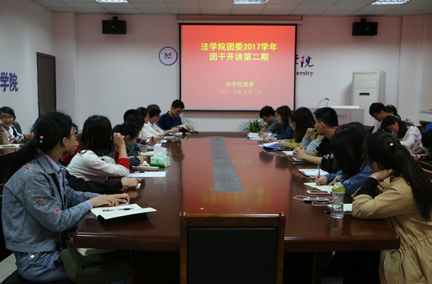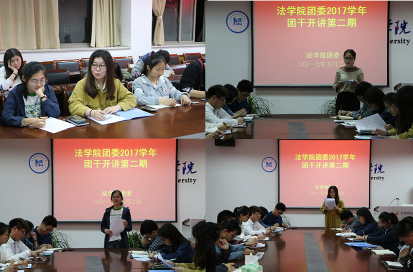 在团支部例会后,三名班级团支书结合“一学一做”活动和班级团建工作进行第二期“团干开讲”活动,15法二团支书葛琪琪从班级政治面貌、管理制度和教育制度三方面展开讲述,强调应加强思想建设。16法一团支书方梅围绕班级团支部重要性、主要团建活动和先进思想学习心得三方面进行讲解,表示将开创更多有益活动以增强团员间凝聚力。16法二团支书张博雪就团支部基础工作、本班团支部建设、团支部品牌活动、近期共青团热点看法和对团支部发展意见进行阐述,介绍 “我是最佳法律人才”