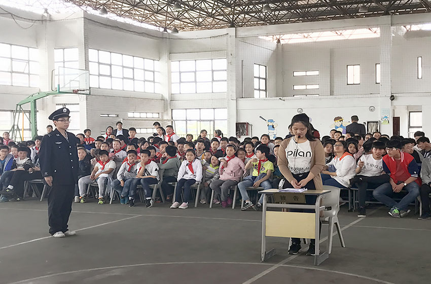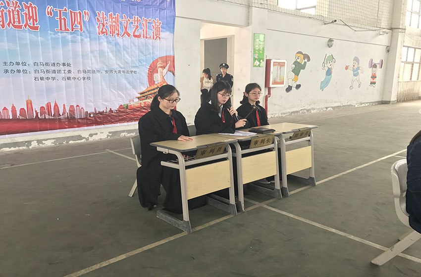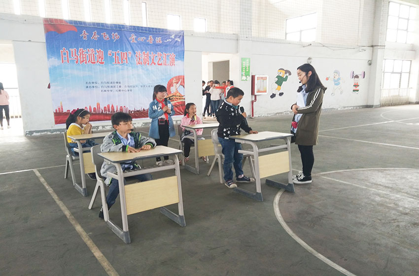 活动在相关部门的协调下顺利开展,主持人致词欢迎各位嘉宾的到来并邀请白马街道党工委副书记茆小平发言。本次汇演一共有4个节目,前两个节目分别是情景剧和小品,由石硊中心学校的的学生们表演,剧本由青法社提供。情景剧讲述两名小学生由于“绰号”产生纠纷最终经过反省和调解而和好如初的故事,其中蕴含关于公民名誉权、人格权的法律知识。小品则通过幽默的语言和表演再现诈骗真伪难辨的现实问题,以新方式教育同学们要知法懂法。紧接着,青法社志愿者们为同学们带来了一首诗歌朗诵——《五四礼赞》,宣扬了五四精神。最后是普法志愿者们带来的模拟法庭节目《90后母亲杀害亲生男婴案》,为同学们生动的还原了法庭现场。