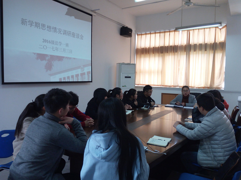 为更好地了解新学期同学们的思想情况,3月3日,2016级法学一班在辅导员储梦凡的带领下于bet36365路检测中心行政楼五楼公共管理系教研室召开了新学期学生思想情况调研座谈会。此次活动共有十三名同学参加。