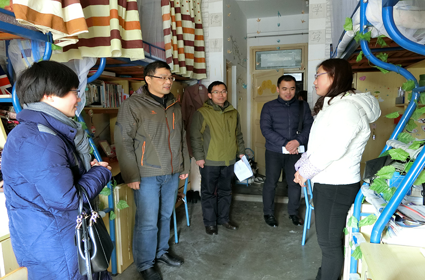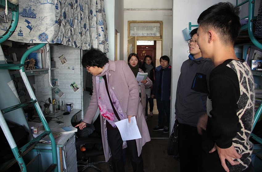 在查寝的过程中,同学们都很热情地欢迎老师们的到来,积极主动地与老师进行交流,并介绍寝室的相关情况。与此同时,马广见就寝室安全问题,再三督促大家要遵守寝室安全条例,增强安全防范意识,在做好寝室基本卫生的同时,也要注重常见的交通、饮食等方面的安全问题。随后,彭凤莲强调要严明纪律规范,加强防范意识,构建和谐校园。屈光峰对安全卫生较好的寝室进行了表扬,也就许多存在安全隐患的地方做出了纠正与指导,并要求严禁使用违规电器,杜绝用电隐患,严禁晚归不归。老师们也询问了同学们学习与生活方面的问题,并希望他们能在期末的这段时间内合理安排作息时间,认真复习,加强锻炼,在构建安全校园的同时,也要建设良好端正的学风。