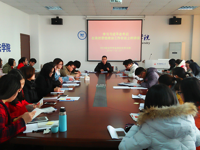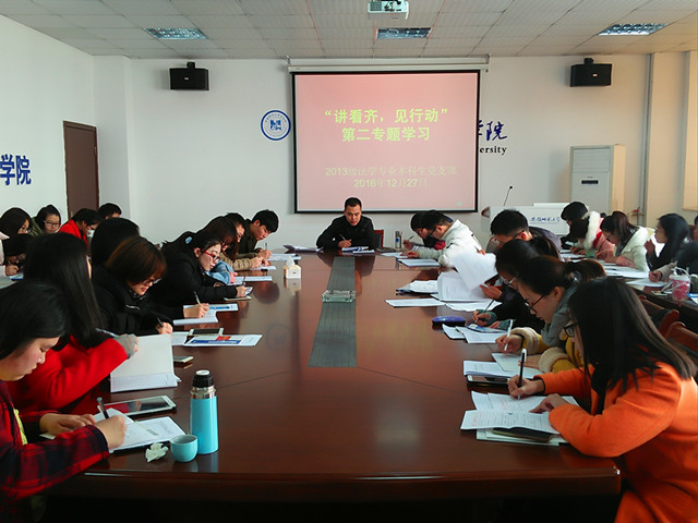 12月27日下午两点,bet36365路检测中心2013级法学专业本科生党支部在院行政楼四楼会议室召开了“讲看齐,见行动”第二专题学习会,党支部书记陈兴宇主持,支部全体党员参加此次专题学习会。
